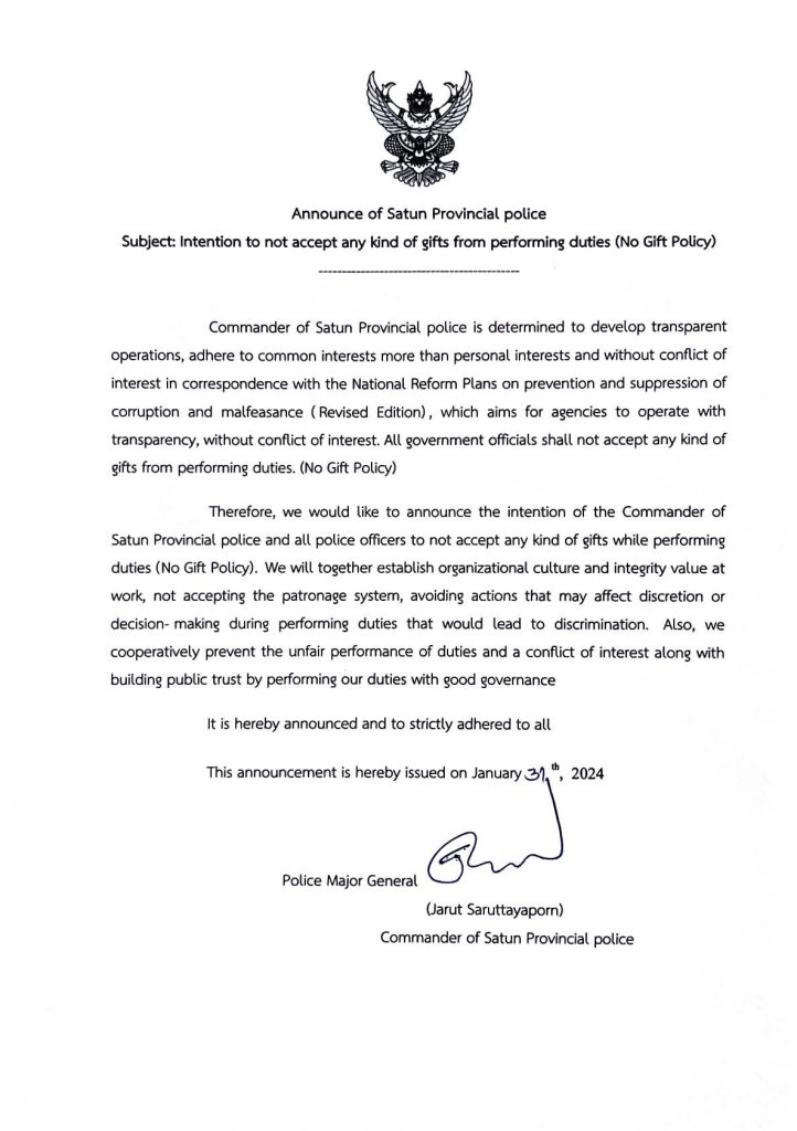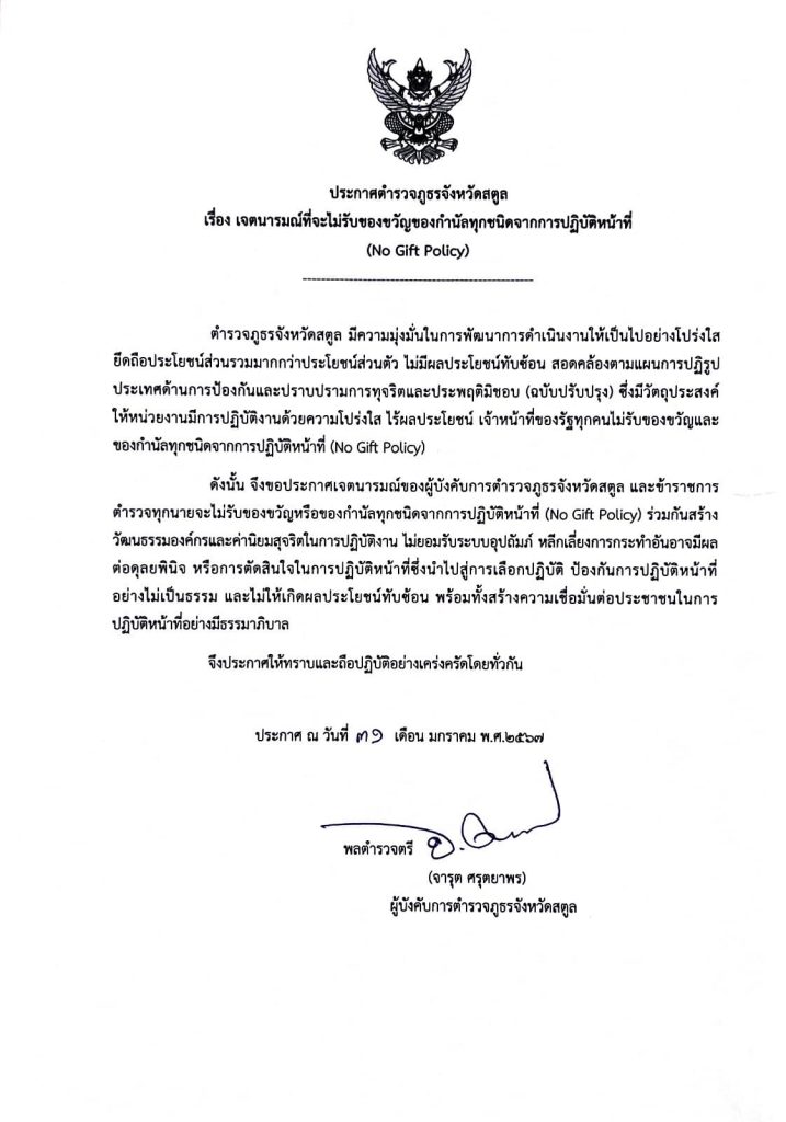 1 ก.พ., 2567 ประกาศตำรวจภูธรจังหวัดสตูล เรื่องเจตนารมณ์ที่จะไม่รับของกำนัลทุกชนิดจากการปฏิบัติหน้าที่ ข่าวกิจกรรม