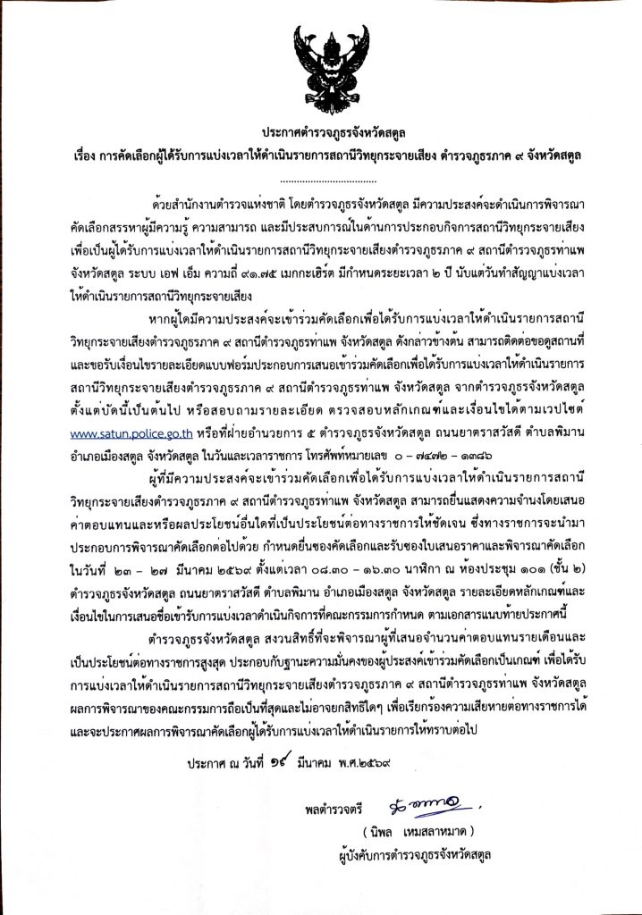 ประกาศตำรวจจังหวัดสตูล เรื่อง การคัดเลือกผู้ได้รับการแบ่งเวลาให้ดำเนินรายการสถานีวิทยุกระจายเสียง ตำรวจภูธรภาค 9 จังหวัดสตูล
