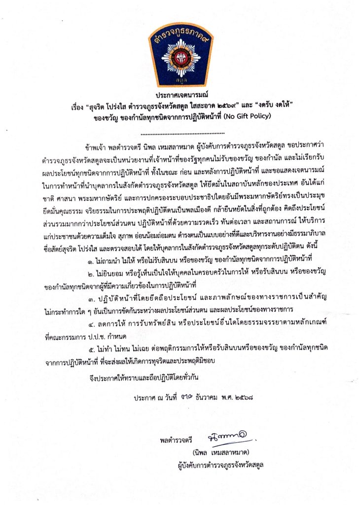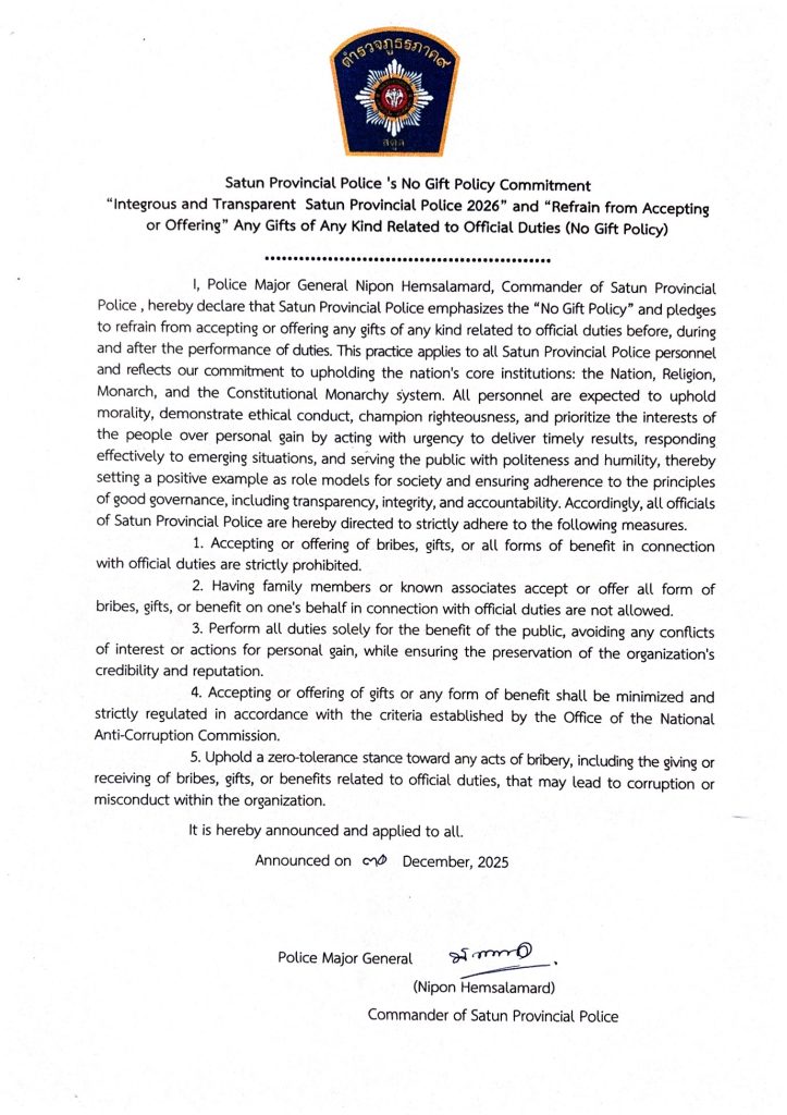 30 ธ.ค., 2568 ตำรวจภูธรจังหวัดสตูล ขอประกาศเจตนารมย์ “สุจริต โปร่งใส สตูลใสสะอาด 2569” และ งดรับ งดให้ ของขวัญกำนันทุกชนิดจากการปฎิบัติหน้าที่ No Gift Policy ข่าวฝากประชาสัมพันธ์